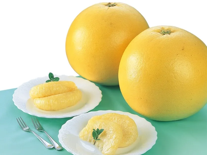 平均的なもので直径約20cm、重さ約2kgという世界最大級の柑橘類・晩白柚。ギネス世界記録にも「世界で最も重いザボン類」として登録されています。上品な香りと日持ちのよさが特徴で、香りと見た目を楽しんだあとにおいしく味わうことができるため、贈答用としても人気です。果実はサクサクとした食感と甘酸っぱい味わいが特徴で、そのまま食べるほか果肉入りゼリーやソースなどにも使用されています。また、厚い皮は砂糖漬けなどに加工されています。